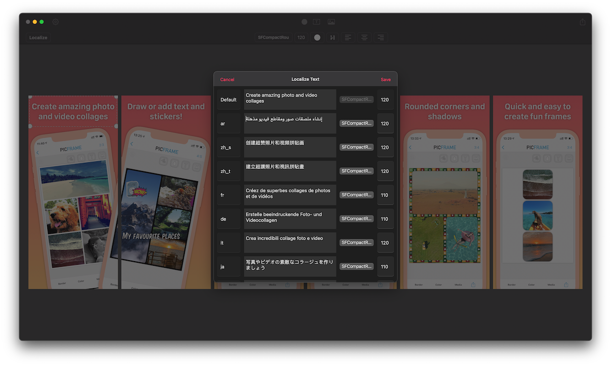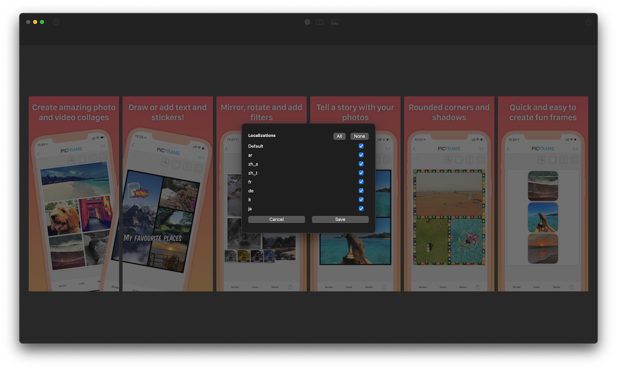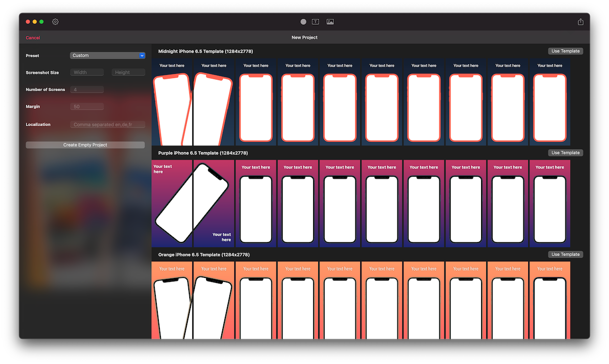 Creating screenshots to promote your app in the App Store has never been easier. Use one of the templates and simply drag your screenshots in, edit the text and then output your screenshots ready to upload! If you are selling your app in multiple languages then you can also localize the text and screenshots and save all localizations at once. If you've done this manually before then you'll know how much time this will save you!