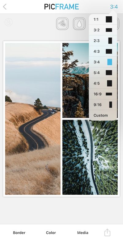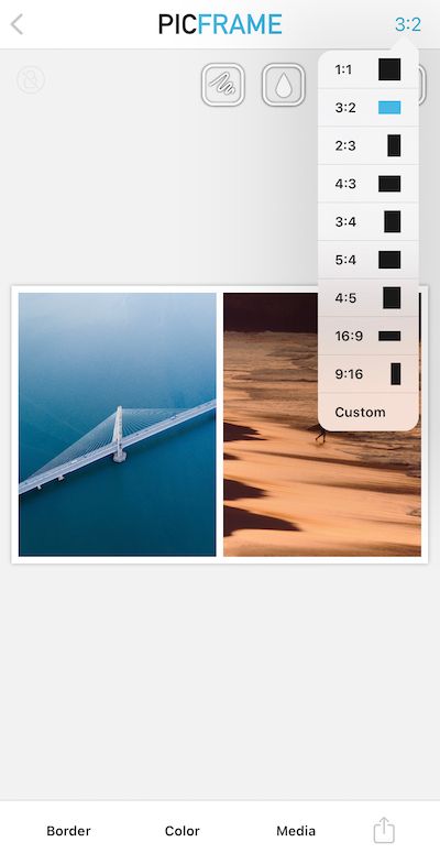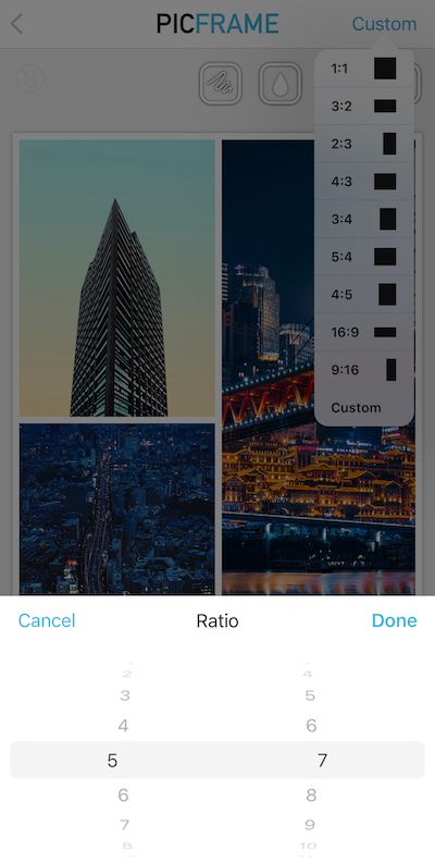 When using PicFrame to create collages, you can select a desired ratio that aligns with your intended print size. By choosing the appropriate ratio, you can ensure that your collage fits perfectly when printed. If the ratio isn't available as a preset then you can tap Custom and specify it yourself.